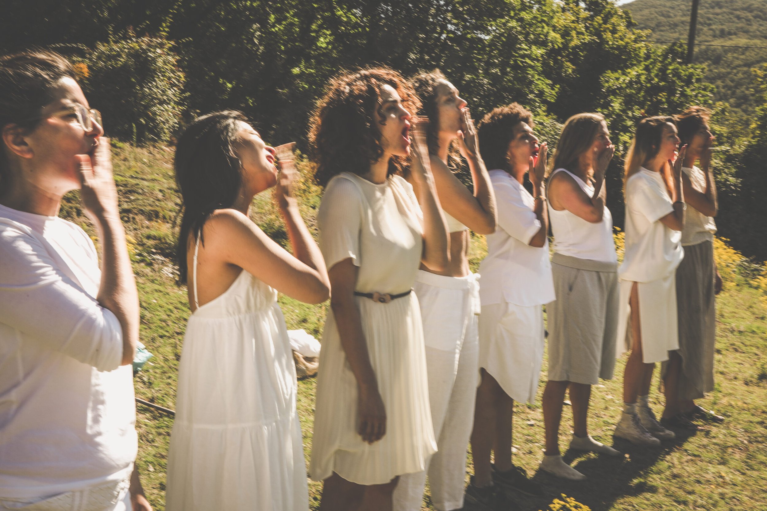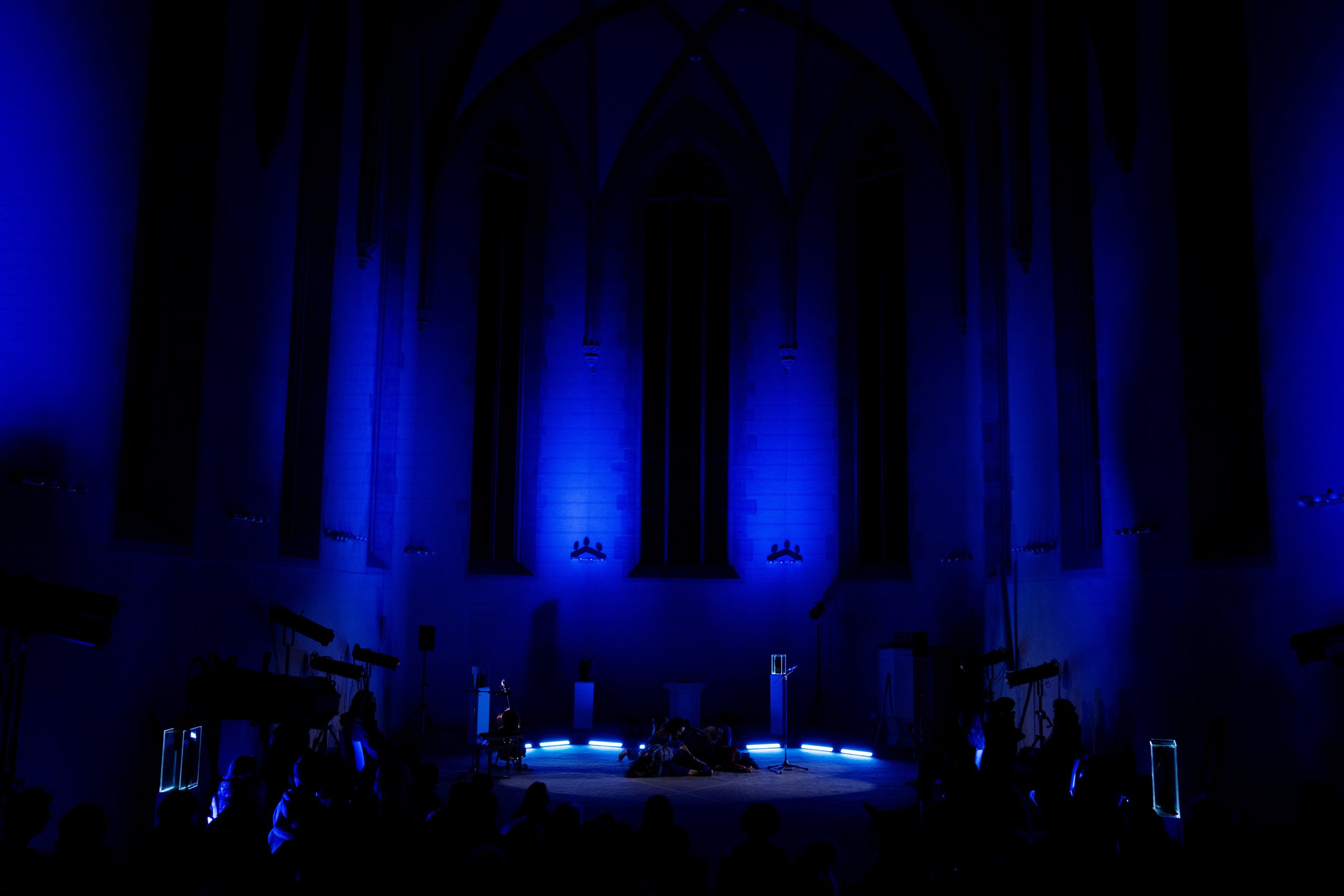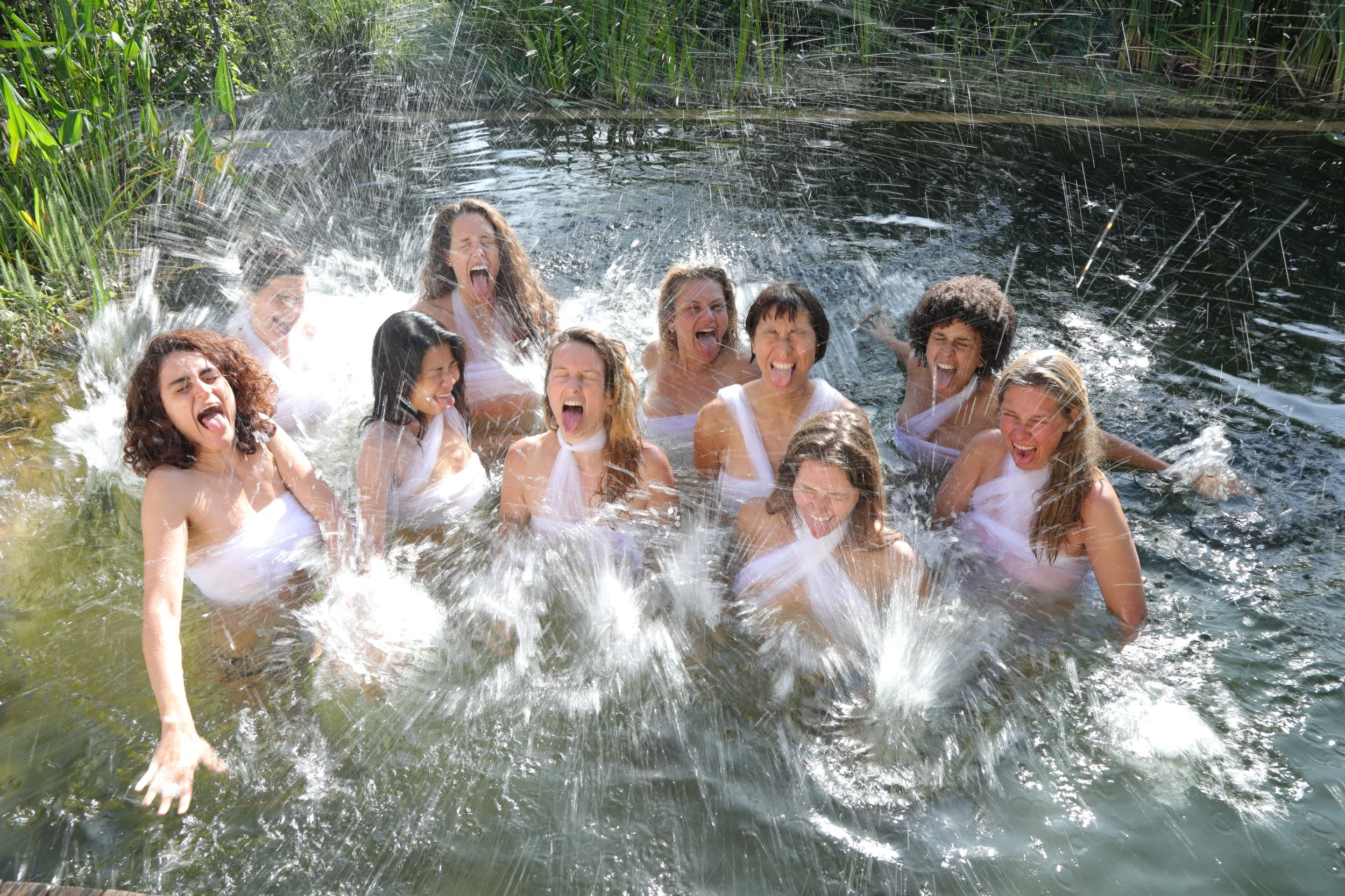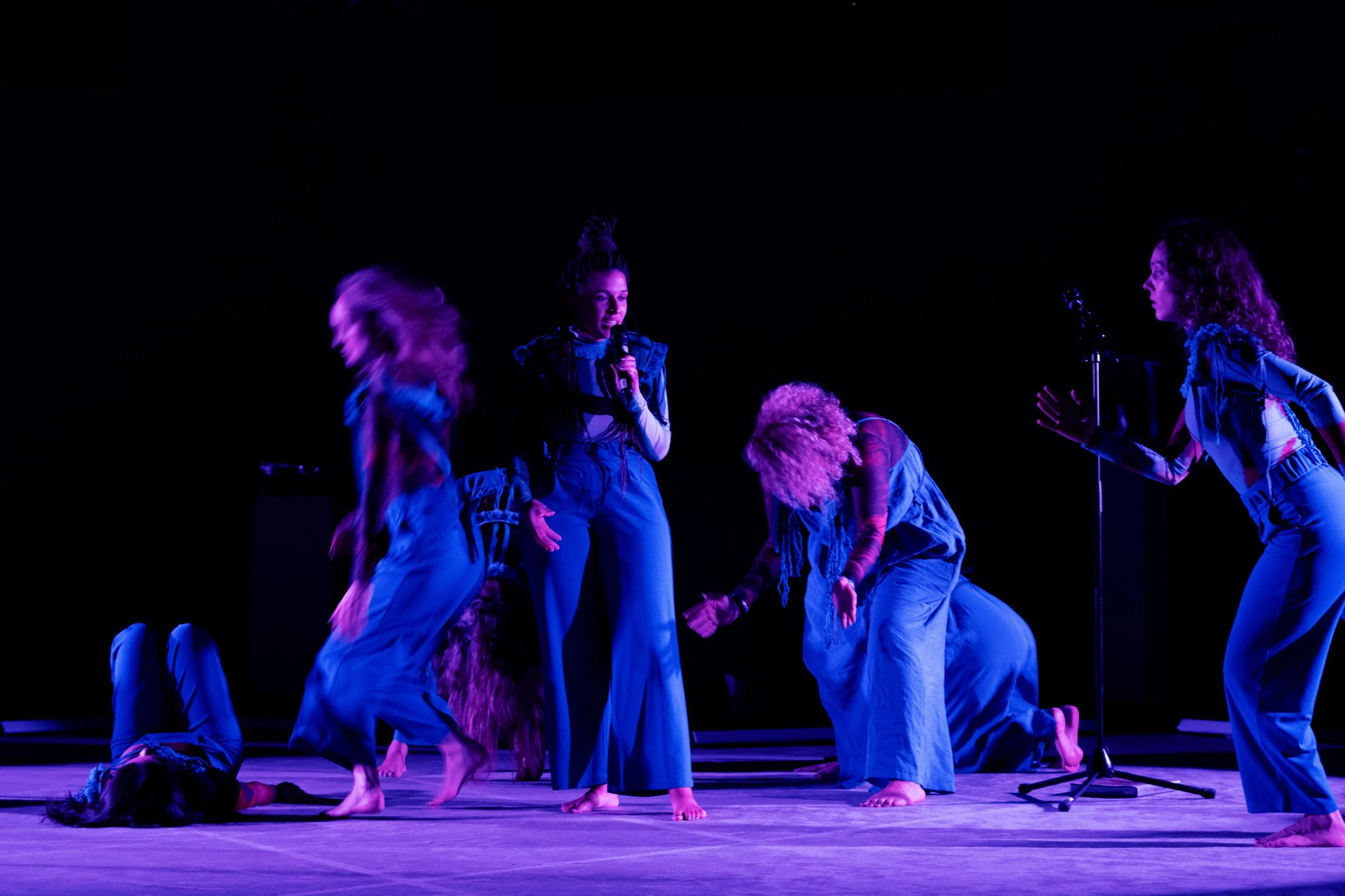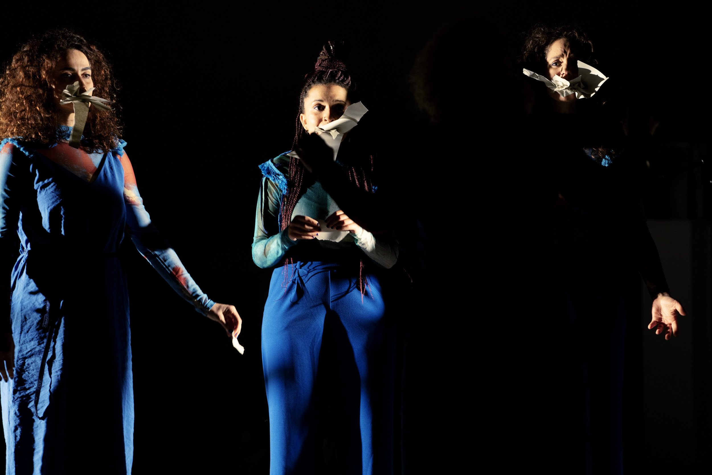 Das Echo von sieben Gestalten rückt in die Gegenwart. Ihre Erzählungen, geprägt von den Narrativen der Vergangenheit, treiben an die Oberfläche, werden laut und zerfallen. Sich von den schweigenden Gewässern abnabelnd, beginnen die Performerinnen eine Sprache zu formen, die sie nährt und spiegelt.